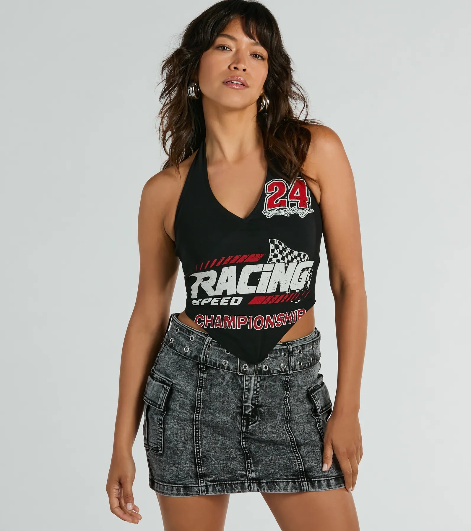 Show off your current status as champion in this graphic crop top! The halter V-neckline with tie adds a modern flair. while the front graphic and script reading "Racing Championship" showcase your passion for the sport. and the cropped hem flaunts your figure. Complete the look in high-rise jeans for casual plans.