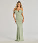 • Side ruched seams. mermaid silhouette. floor-length hem
