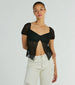 A date night or festival must have! This charming lace crop top shows off your adorable figure with puff short sleeves. a sweetheart neckline. button front closures. and a cropped hem with slit detail. The sheer lace fabric adds a touch of romance to your bold and adventurous look. Complete the look in a mini skirt.