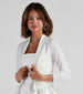 Elevate your look to a new level of chic with this cropped blazer. It features a lapel collar neckline. three-quarter-length fitted sleeves. and a cropped and fitted hem. Layer this crepe blazer over a bodysuit and pair it with a high-rise pencil skirt for the perf workwear attire.