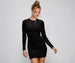 Chic and elevated. this mini dress is a must-have for date nights. It features a crew neckline. long sheer fitted sleeves. and a short. curve-hugging silhouette. The sheer knit fabric has a lining and an all-over vintage-inspired velvet burnout pattern. Style this dress with a sleek clutch.
