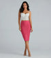 This chic bandage pencil skirt will give you a smooth and sculpted look! It features a high-rise waist. a midi-length hem. and a curve-hugging fit to flaunt your figure. The structured bandage knit fabric offers a figure-flattering silhouette and plenty of stretch. Style this midi skirt with a corset top and stiletto heels for date night.