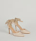 Showcase a chic attitude in these bow-detail stiletto pumps! They feature a closed pointed toe. a thin adjustable ankle strap. a closed back with an adorable rhinestone-embellished tulle bow accent. and a sleek stiletto heel. The pumps are composed of a smooth satin material with a faux leather subtle cushioned insole. Style with an envelope clutch for a dressy dinner date!