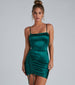 Showcase your beauty in this chic and sleek satin mini dress that is perf for a night out with the girls! It features a sleeveless bodice. spaghetti straps. a square neckline. front ruching. and a mini-length. curve-hugging silhouette with a drawstring at the hem. Complete the look with heels and a stylish clutch.