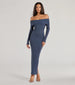 This trendy ribbed knit maxi dress is a chic choice for the season offering plenty of stretch for comfortable wear. It features an off-the-shoulder fold-over neckline. long fitted sleeves. and a maxi-length bodycon silhouette accented with a back slit.