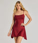 Join the chic club in this stunning mini dress designed with smooth and stretchy knit fabric for comfortable wear. It features a sleeveless cowl neckline with pleated detailing. spaghetti straps. and a short asymmetric hem with a flowy A-line silhouette.