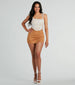 Amp up your everyday 'fits with the chic silhouette of this faux wrap ruched mini skort! Designed with a smooth faux suede fabric. this skort features a high waist with ruched detailing to accentuate your curves. The fitted shorts have a chic faux wrap overlay with a side slit accent for a trendy touch. Style with a corset top and mules for happy hour!