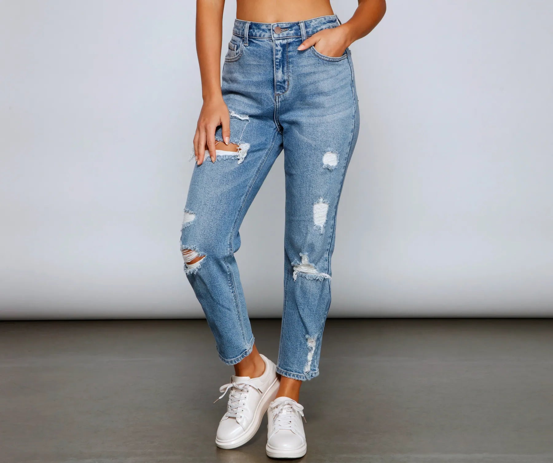 Start off a fire 'fit with these trendy boyfriend jeans! They feature a high rise waist. a traditional five-pocket and belt loop design. distressed detailing. and straight pant legs with an ankle cut hem. Style these jeans with a cute crop top and strappy heels.