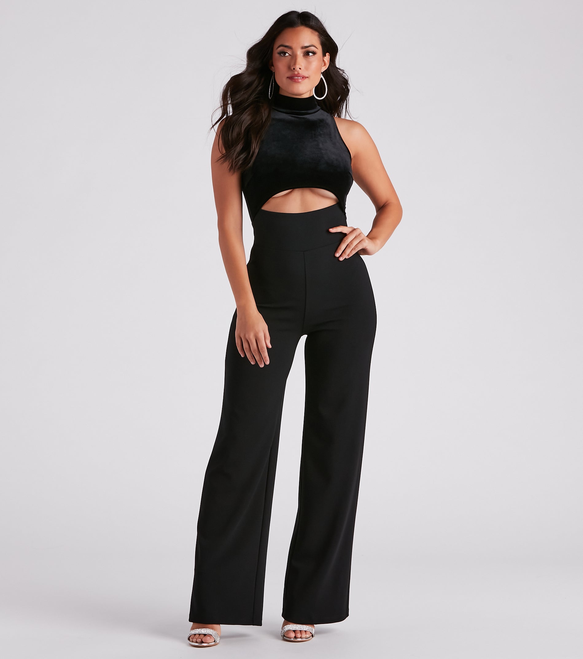 Be a chic diva for the night in this elevated velvet cutout jumpsuit! It features a sleeveless velvet top with a mock neckline. an alluring cutout under the bust. a large keyhole cutout at the back with button closures. and crepe pants with a high-rise fitted waist and a trendy wide-leg silhouette. Style this look with rhinestone hoops and clear heels.