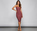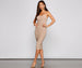 This midi dress brings the chic factor to your night out look! The dress features a sleeveless sweetheart neckline. spaghetti straps. a ruched body. and a midi-length silhouette. The dress is composed of a lined smooth knit fabric that offers a form hugging fit with a moderate stretch. Complete look with clear heels and gold hoops.