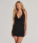Dare to allure with chic glamour in this glitter knit mini dress featuring a sleeveless plunging cowl neckline and tie-back halter straps that lead to a bold open back. The ruched wrap-front bodice and mini-length bodycon silhouette will accentuate your gorgeous curves.
