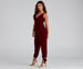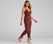 Make a chic impression with a jumpsuit that can be dressed up with door knocker earrings and clear mules. The jumpsuit features a wrap V-neckline.  dual adjustable spaghetti straps that cross at the back. an elasticized waist. hidden side pockets. and a skinny leg with ankle ties. The jumpsuit is composed of a smooth knit fabric with a moderate stretch.