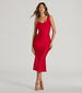 Take the city looking chic for cocktails in this sleeveless midi dress! Featuring a sultry cowl neckline. bungee spaghetti straps. and a form-hugging fit to flatter your curves. Complete the look with earrings. a bracelet. and heels!