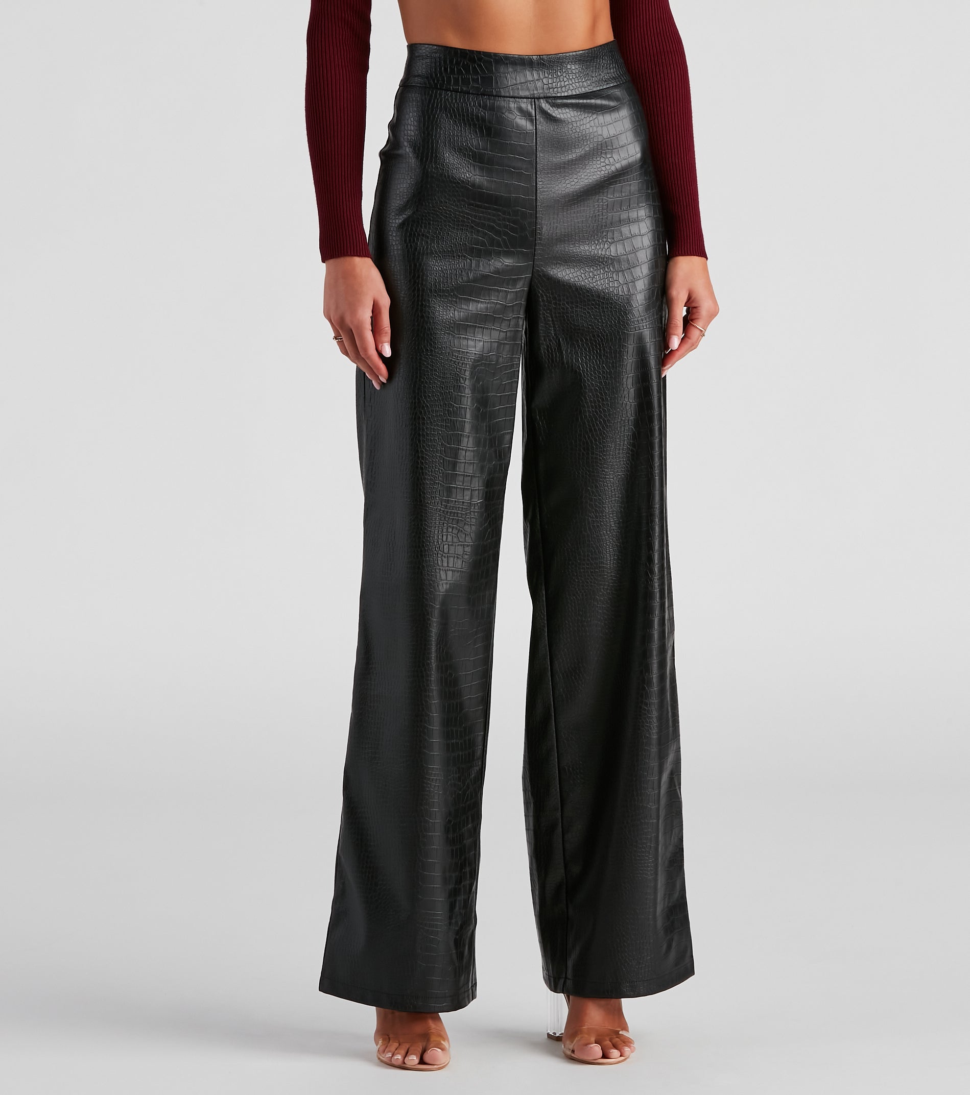 You'll be one chic mate in these faux leather pants featuring a sleek high-rise waist. back zipper closure. and a wide-leg silhouette on croc-embossed fabric with minimal stretch. Complete the look in a crop top and booties.