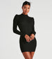 Showcase chic perfection in this classic ribbed knit sweater dress. It features a mock neckline. long fitted sleeves with puff accents at the shoulders. and a short. curve-hugging silhouette. The knit fabric offers plenty of stretch. Style with knee-high boots.