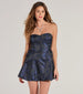 Showcase a chic romantic aura in this floral satin jacquard skater dress featuring a strapless sweetheart neckline. flexible boning at the bodice for added structure. and lace-up sides for a snatched silhouette. The short skater skirt adds a sweet feminine vibe to the stunning style.