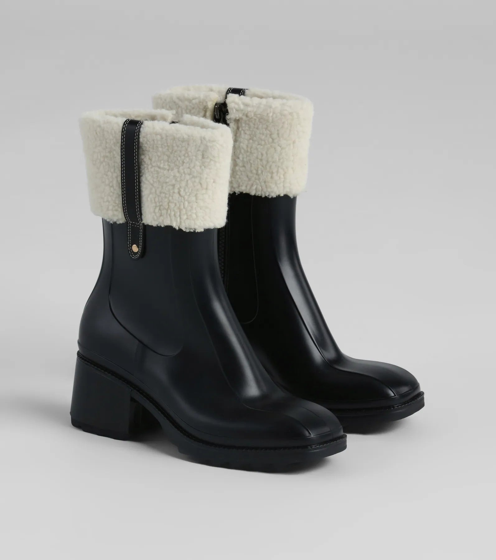 Hop into these chic rain boots to keep you cozy and protected from the drizzle. The rain boots feature a square toe. a sturdy traction lug bottom and block heel. and a soft faux sherpa trim with a strap accent and zipper closure for added flair. Complete the look in style with a cute jacket for a coffee run and errands!