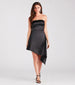 You'll be such a chic standout at cocktail hour in this silky-sleek satin midi dress. It features a strapless straight-across neckline. a fitted bodice. and an asymmetric high-cut midi-length hem with a flowy silhouette. The satin woven fabric has minimal stretch. Style with lace-up stiletto heels!