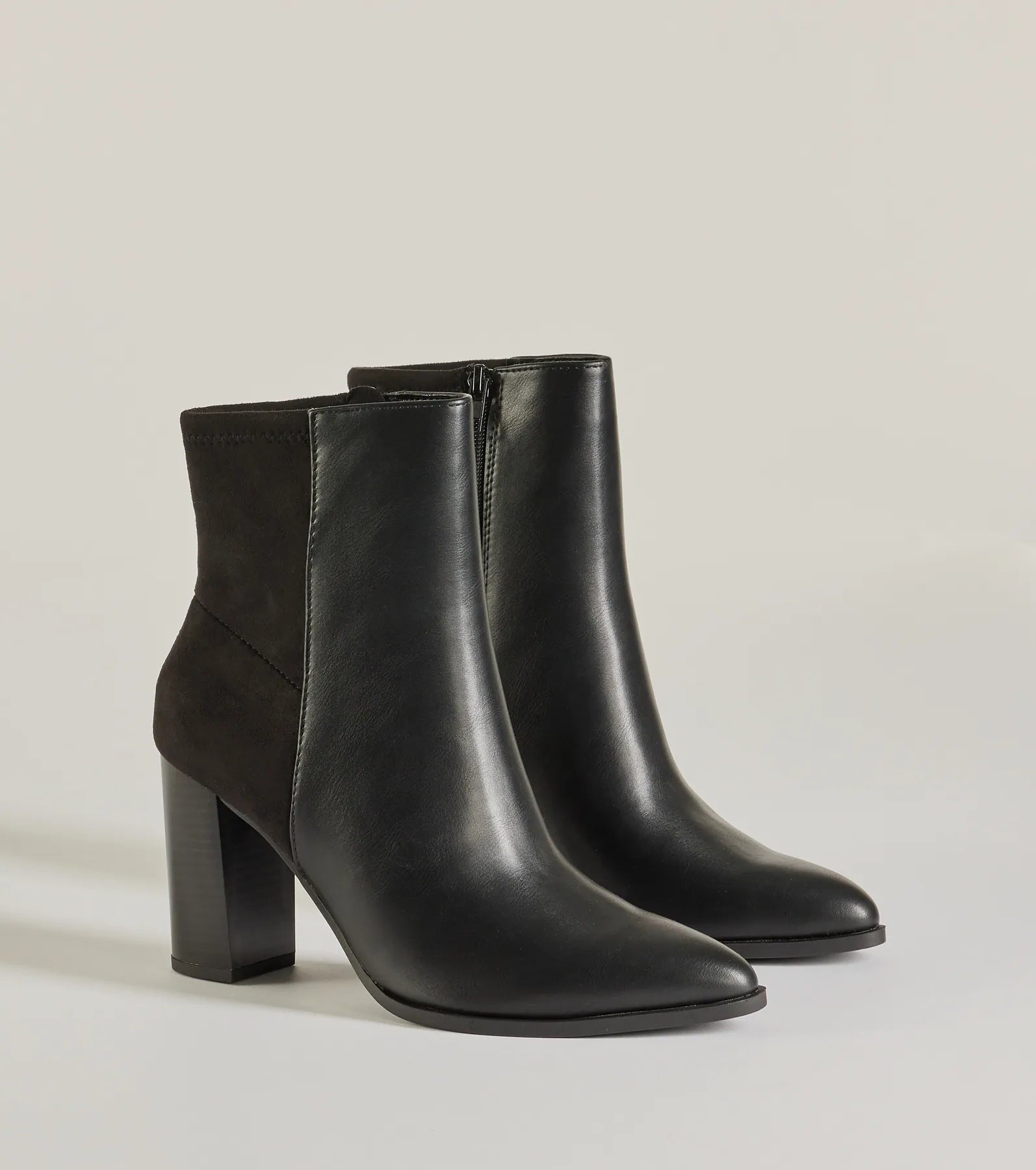 A stylish staple bootie to pull your look together! The bootie features a mixed faux suede and faux leather material. a pointy toe. a tall stacked block heel. and an inner zipper closure. Complete with your favorite cardigan and high waist jeans.