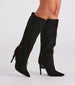 Show off a chic strut in these trendy fringe knee-high boots! They feature a bold pointed toe. a sleek stiletto heel. and side fringe detailing that will sway with each step you take. The smooth faux microsuede material will bring a luxe vibe to your look. Style with a crop top and a faux leather skirt.