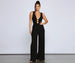 This chic sultry sleeveless jumpsuit is the perf alternative to an LBD for your next night out. It features a plunging V-neck and back with center bar strap detailing. a cinching stretchy smocked waist. and wide pant legs with a relaxed fit. Style this jumpsuit with sleek hoop earrings and strappy heels.
