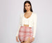 Showcase your chic trendsetter status when you layer on this cropped cardigan! It features long fitted sleeves. a V-neckline. a button-down front. and a cropped. form-fitting style. Complete your look with the matching crop top. a plaid mini skirt. and chunky sneaks.