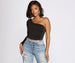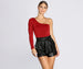 Get a chic vibe in this one shoulder bodysuit! It features a single long fitted sleeve paired with a thong bottom to avoid unflattering lines and dual snap-button closures for a secure fit. Complete the outfit with high waist paper bag pants or high waist denim jeans.