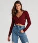 Cutie alert! Keep chill and cozy in this cable knit sweater featuring long sleeves with ribbed cuffs. a surplice v-neckline. and a cropped hem of soft knit fabric. Complete the look in a basic cami and jeans.