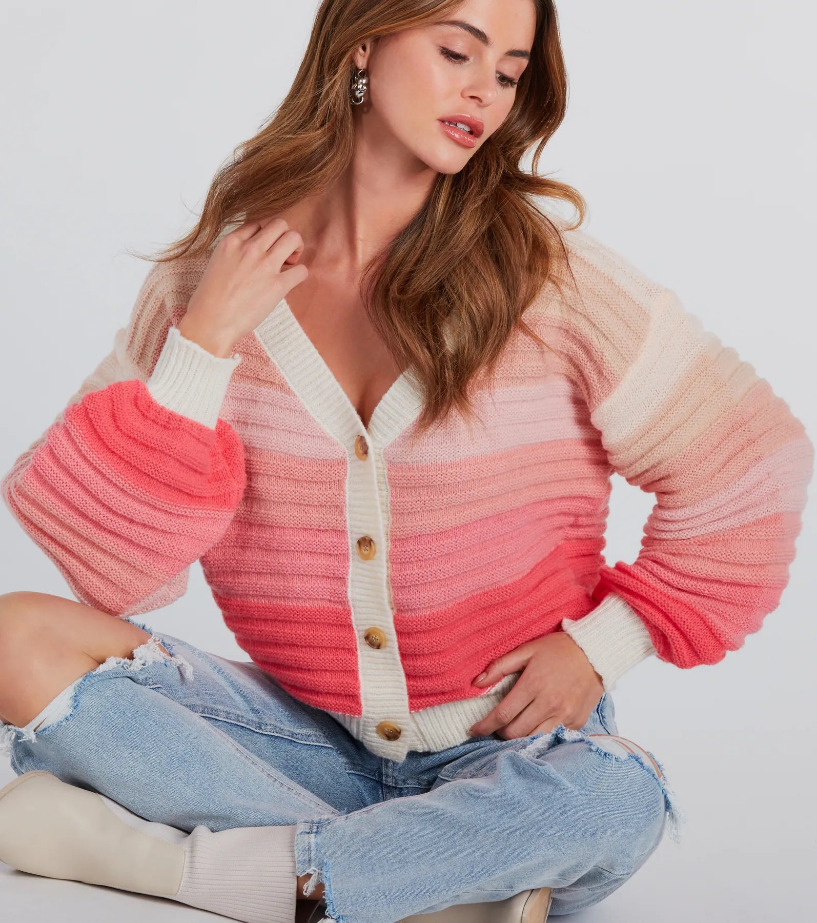 This adorable and cozy striped knit cardigan is perfect for those chill laidback days! It features a V-neckline. a complete button-down front. long balloon-style sleeves with tapered hems. a relaxed fit. and a trendy ombre striped pattern on the ribbed sweater knit fabric. Complete your cute and casual look with distressed jeans and ankle boots.