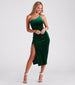 Stealing the spotlight is a guarantee in the Christen formal velvet dress perfect for ceremonies and dinner parties! She delivers allure in a sleeveless one-shoulder neckline. dual spaghetti straps. and a high-waist seam leading to her bodycon. midi-length hem with a flirty slit. The formal dress is composed of luxurious velvet-lined knit fabric with minimal stretch. Style with a sparkling necklace and earrings set to complete the look!
