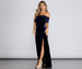 Bring the elegant drama in our stunning Christen formal dress! She features an off the shoulder foldover square neckline. a back zipper closure. a high waist seam. a thigh high front slit. and floor length. form hugging fit. The dress is composed of a smooth velvet fabric. offering moderate stretch.