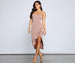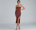 Step out like a scene straight out of a rom-com in a midi dress that gives major butterflies! The city-chic midi dress features a sleeveless square neckline. spaghetti straps that lead to a cross-strap design. and a high side slit on the left leg with a romantic ruffled trim. The relaxed fit waist leads to a midi-length A-line silhouette. The dress is composed of a smooth knit fabric that offers a form-hugging fit with a moderate stretch. Complete look with mules.