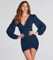 Shine bright in this stunning glitter mini dress! Featuring long peasant sleeves. a plunge V-neckline. a flirty cut-out back and tie closure. ruched seams and bodycon silhouette. and a mini-length hem. you'll look and feel chic. glamorous. and confident. Complete the look with a clutch purse for a cocktail party or event!
