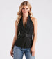 Classic and iconic. this elevated vest top will snatch your waist for a stylish silhouette. It features a sleeveless V-neckline with a lapel collar front design. halter shoulder straps. a partial open back. a belted waist. dual front pockets. and a fitted mid-length hem. Pair with your favorite jeans and clear mules to level up your casual looks.
