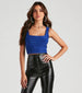 This classic casual cropped tank is a wardrobe staple. It features a sleeveless square neckline. thin tank shoulder straps. ruching down the side seams. and a cropped. form-hugging fit. Style with a faux leather mini skirt and strappy heels for a dressier vibe.