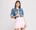 Layer on some classic chic with this must have jean jacket! It features a collar. a button down front. mini top buttoned pockets. slanted front pockets. three fourth length sleeves with buttons to cuff. and a cropped hem. The jacket is composed of a medium wash denim fabric with no stretch.