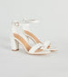 These simple yet so chic faux leather block heels are a classic choice to wear for your next special occasion. They feature an open almond toe with a strap. a thin adjustable ankle strap. a closed back. and a sturdy block heel. Style with an envelope clutch.