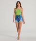 Create the cutest summer 'fits with this classic pair of destructed cut-off denim shorts! Detailed with trendy distressed detailing on the medium-wash denim fabric. these jean shorts are the perfect casual staple. They feature a flattering high-rise waist. a fitted cut-off hem. a traditional five-pocket and belt loop design. and a secure front button and hidden zipper closure. Style with a crop top and strappy sandals.