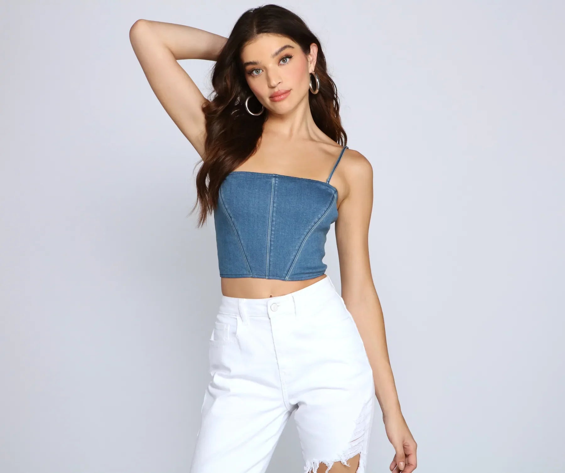 Add this classic staple to your wardrobe for those girl next door vibes! The corset features a sleeveless square neckline. adjustable spaghetti straps. corset seams with flexible boning. and a cropped hem. The back features a multi-row hook and eye closure. Complete look with high waist jeans.