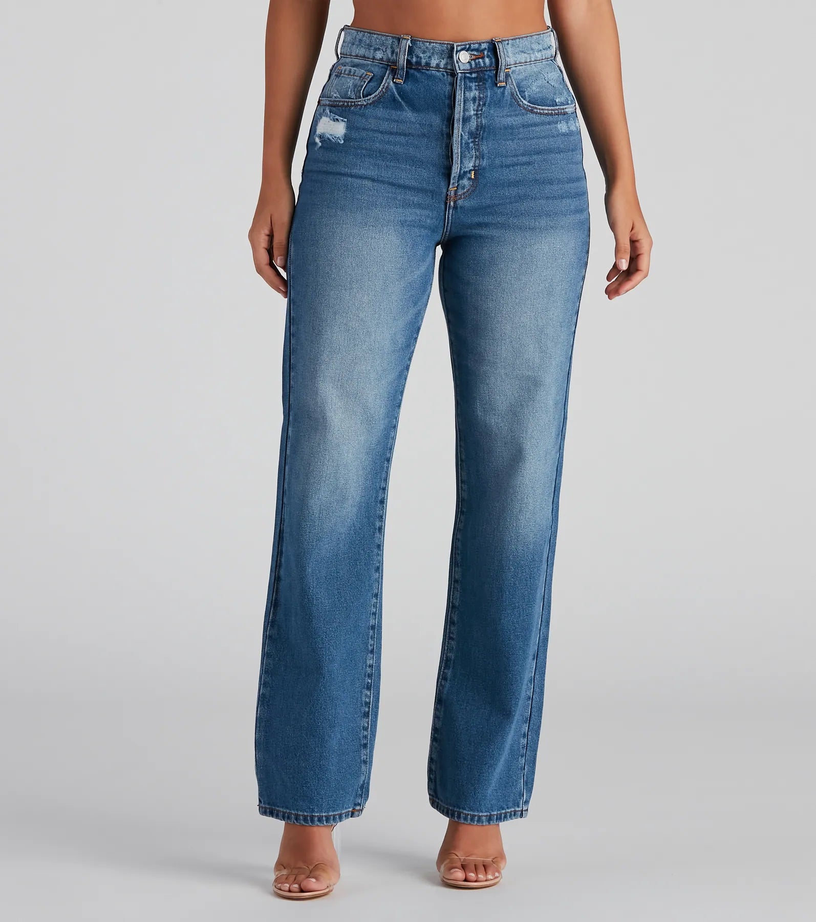 Channel a classic look with jeans that are perf to dress down for a casual look! The jeans feature a high-rise waist. a multi-button front. a traditional five-pocket with belt loop design. light destruction. and a boyfriend leg. Complete look with a bodysuit and chunky sneakers.