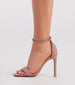 Classy and chic. you'll be wearing these stiletto heels on repeat! They feature a square toe. thin toe strap. ankle buckle closure. and a sleek design on faux suede material. Complete the look in a chic jumpsuit for a day or night occasion.