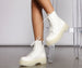 Get your look on fleek. girl! These boots bring a chic edge to your outfit. The boots feature a mid-calf length. a lace-up front. and a clear lug sole. The boots are composed of a faux leather material. Complete outfit with a bomber jacket.