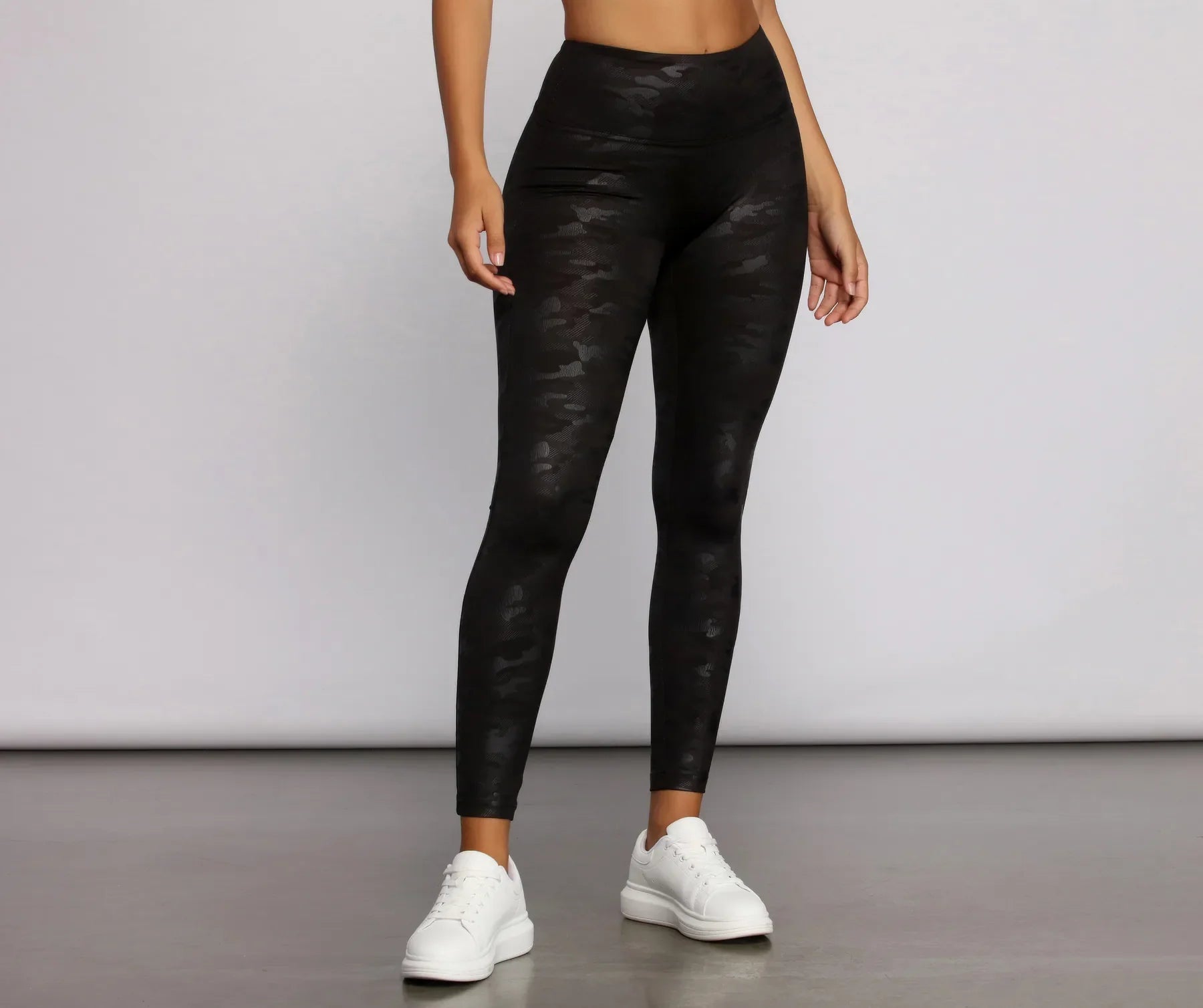 These coated camo leggings will pull your chic athleisure look together! They feature a high rise banded waist. a neutral camouflage print with a sleek coated finish. and a form-hugging fit to show off your curves. A must-have for running everyday errands. style with a basic cami and some chunky sneakers.