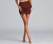 This mini skirt gives dressy vibes for cocktail hour! It features a high rise waist. and a curve-defining side ruching with an adjustable drawstring and slit accent on the fitted silhouette. Composed of slinky knit fabric with a moderate stretch. Style with fab booties and bodysuit.