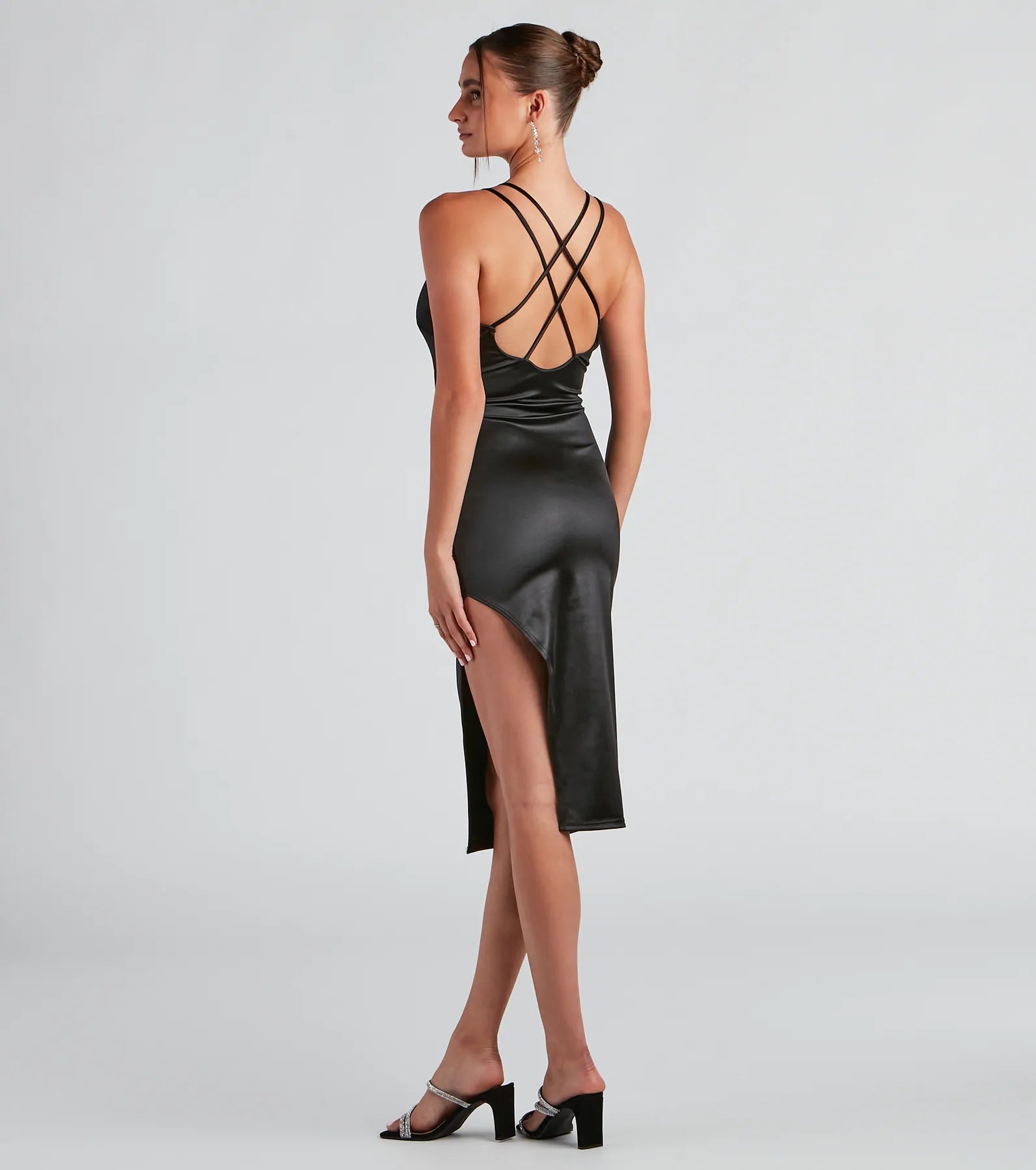 Elevate your look for cocktail hour with this sleek satin midi dress! It features a sleeveless V-neckline. dual spaghetti straps that lead to a cross-back design. a midi-length hem with a curve-hugging bodycon silhouette. and a chic high side slit. Style with strappy stilettos.