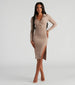 This soft ribbed knit midi dress is perfect for fall coffee dates! It features a collared V-neckline. long fitted sleeves. a partial faux button-down front. a midi-length hem with a high front slit. and a form-hugging fit. Style with knee-high boots for a chic autumn look.