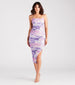 Make a splash this summer in this colorful tie-dye midi dress! It features a sleeveless square neck. adjustable spaghetti straps. side ruched seams that accentuate your curves along the bodycon silhouette. a flirty side slit. and a midi-length hem. The dress is designed with a trendy all-over tie dye print and glitter on mesh fabric with a sewn-in knit lining. Complete the look in heels for an outdoor party!