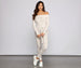 Get an effortless. comfy-chic vibe in this adorable catsuit! It features an off the shoulder neckline with a fold-over detail. long fitted sleeves. a tie front at the waist. and fitted pant legs. The jumpsuit is composed of a very soft. cashmere-like ribbed knit fabric. Pair this jumpsuit with faux fur slippers to lounge at home. or a pair of chunky sneakers for a coffee date.