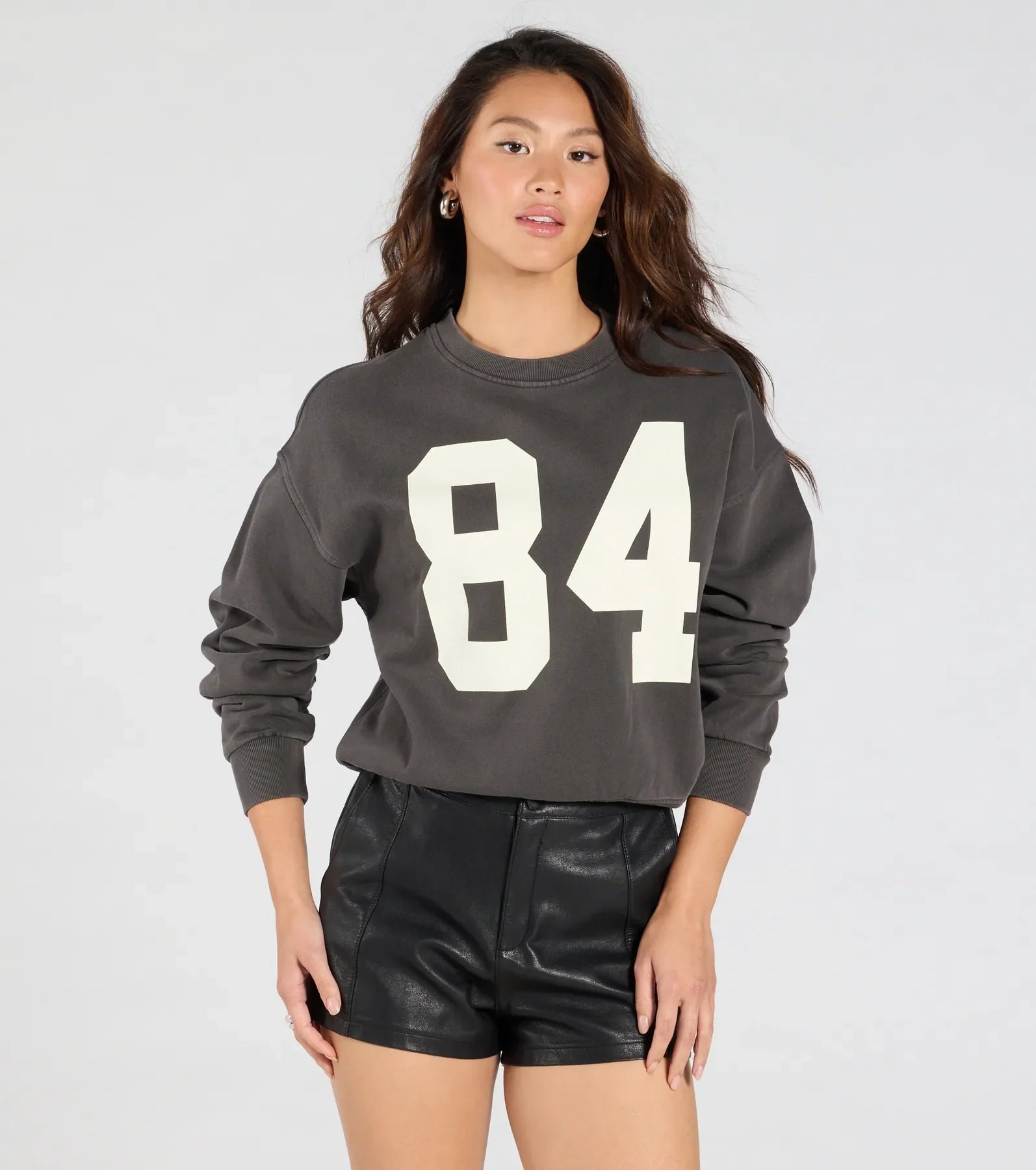 Take on a comfy trend in this 84' graphic oversized sweatshirt for a cozy cute look on your off-duty days!