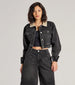 Layer on this denim trucker jacket for a cool girl aesthetic! It features a trendy corduroy trim collar and front pockets while the cropped cinch hem lets you flaunt your figure. Pair with high-rise bottoms.